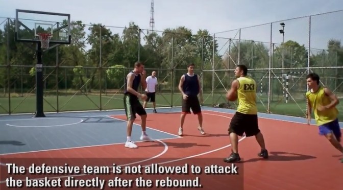 The defensive team is not allowed to attack the basket directly after the rebound. Even in the case of an air ball by the offensive team, the defensive team must clear the ball behind the 3 point line.